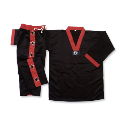 Description: Kick boxing uniform made of 100% polyester (satin),jacket with red v-neck, short sleeves, red trimming at arm holes, trousers are with red stripe and waist.