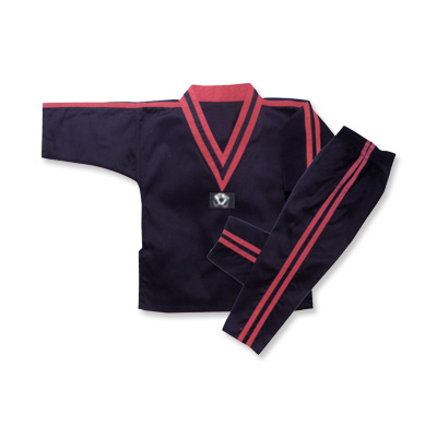 Description: V-necktop and pant made of black drilled 100% cotton 8 oz, with two red stripes trouser with elastic waist.