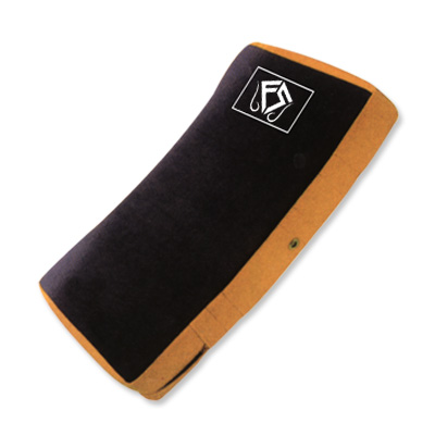 Description: Curved kick shields made of strong durable synthetic leather, filled with superior quality 5" thick soft foam for greater absorbency, with stands with repeated kick and ponches, retains its shape, holes at sides and back, handles with proper re-inforcements.