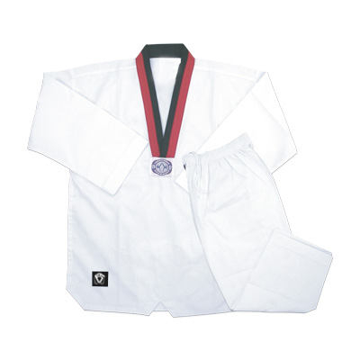 Taekwondo uniforms made of white drilled cotton (100%) 7 oz, with white V-neck, white belts, trousers with elastic waist.