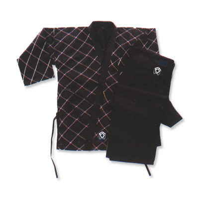 Description: Hapkido uniform M/O drilled black poly-cotton(55%+45%)7.50 oz, With white diamond stitches trouser are with or without drawstring waist.