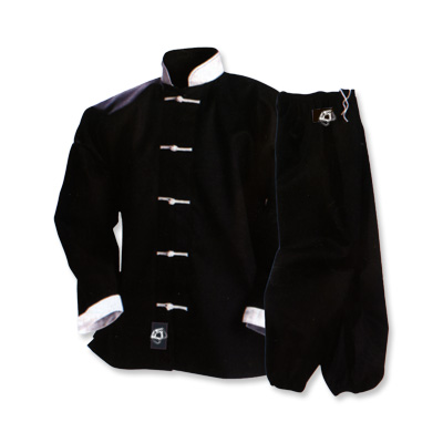 Description: Kung fu uniform M/O drilled black poly-cotton(55%+45%) 7.50 oz, With white buttons, white collar, white cuffs, trouser are with elastic waist and ankles.