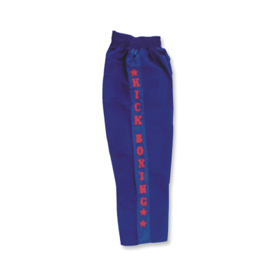Description: Kick boxing trousers,made of 100% polyester (satin) with kick boxing writing and with strips.