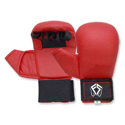 Description: Karate mitt made of p.u, with fingers and thumb, pre-shaped inside padding, with elastic + velcro closure for better support.
