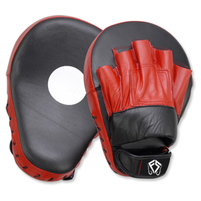 Description: Curved focus pads made of fine genuine leather, filled with high density foam padding, exposed fingers, strap with velcro closure at wrist for extra support.