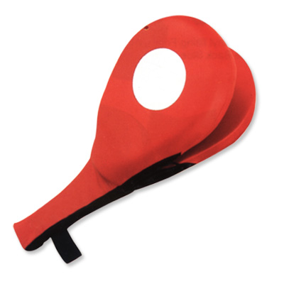 Description: Double floppy mitt made of synthetic leather, filled will flexible foam padding allowing to and fro movement without breaking it, strong handle with elastic hand grip, with white target.